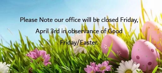 Please note our office will be closed Friday, April 3rd in observance of Good Friday/Easter!